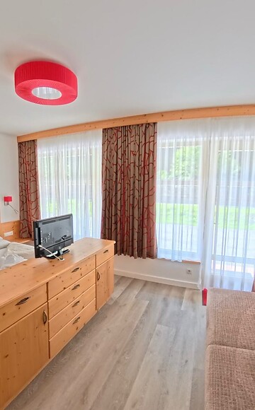 Slaapkamer met TV, kluis en uitzicht op de Gerlosbach;